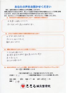 最初のころは、ひざに水がたまり曲がらないし、しゃがむこともできない、それに加えて腕が肩の高さよりも上がらない状態で、クタクタになって来院されたことを覚えています。