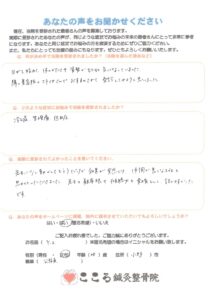 「先生に少し動かしてもらうだけで効果が実感でき、体調が良くなるかもと思わせていただきました。先生の観察眼や傾聴力も素晴らしく、話しやすかったです。」