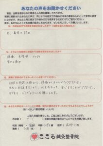 さらに、4回目の施術の時には、生理前のイライラもなく生理前の腰痛も起こらなかったと教えてくださいました。