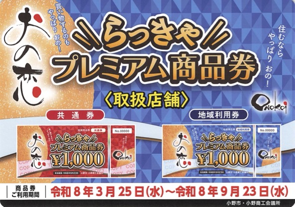 兵庫県小野市では、令和8年3月に小野市民の方限定に【おの恋らっきゃプレミアム商品券】が販売されました。